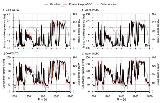 Intake manifold pressure and turbocharger speed in cold and warm WLTCs with baseline ATS and pre-turbine pre-DOC configurations during the high- and extra-high-speed phases. (a) Intake manifold pressure in cold WLTC, (b) intake manifold pressure in warm WLTC, (c) turbocharger speed in cold WLTC, (d) turbocharger speed in warm WLTC.