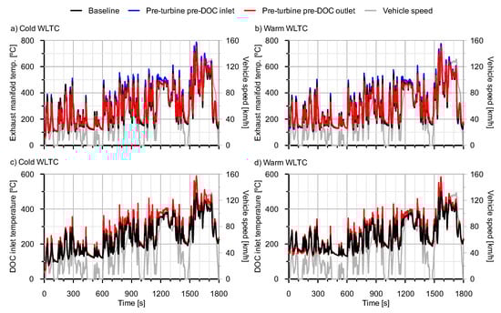 Pre-DOC, turbine and DOC inlet temperature in cold and warm WLTCs with baseline ATS and pre-turbine pre-DOC configurations. (a) Exhaust manifold temperature in cold WLTC, (b) exhaust manifold temperature in warm WLTC, (c) DOC inlet temperature in cold WLTC, (d) DOC inlet temperature in warm WLTC.
