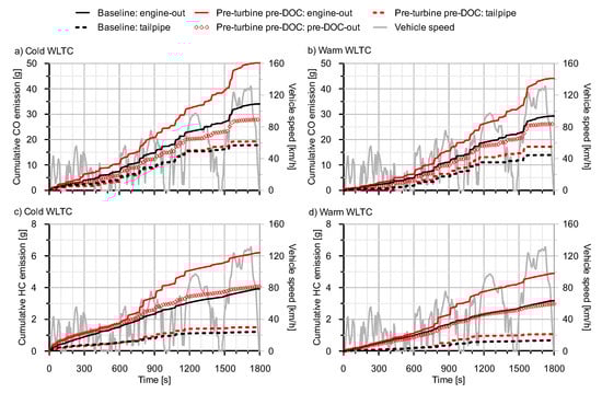 Cumulative CO and HC emission along the exhaust line in cold and warm WLTCs with baseline ATS and pre-turbine pre-DOC configurations. (a) Cumulative CO emission in cold WLTC, (b) cumulative CO emission in warm WLTC, (c) cumulative HC emission in cold WLTC, (d) cumulative HC emission in warm WLTC.