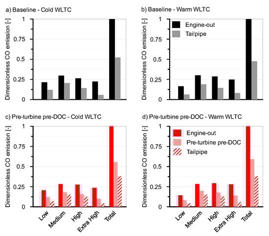 Complementary, Figure 9c,d represent the normalized cumulative CO emission distribution for the pre-turbine pre-DOC configuration. The main trends in CO engine-out emission and abatement for the baseline case were also found with the pre-turbine pre-DOC configuration. The cumulative CO emission in every exhaust region behaved as their counterpart in the baseline ATS configuration, both in cold and warm WLTCs. The most relevant result is that the percentage tailpipe CO emission was lower than the one obtained in baseline ATS configuration in every cycle phase. A detailed analysis of the CO conversion efficiency with pre-turbine pre-DOC shown in Figure 10 reveals that the presence of the pre-DOC enhanced the overall CO abatement throughout the cycle, especially during the low-speed phase in cold WLTC. The pre-DOC contributed with very high conversion efficiency, which was comparable to that of the DOC in baseline ATS configuration during the cold WLTC. The reason of the high pre-turbine pre-DOC reaction rate was two-fold. First, this catalyst operated at higher temperature than the DOC. In addition, the reactants partial pressure in pre-turbine location was also higher than in the DOC because of the higher gas pressure prior to the turbine. Higher CO and HC mole fraction was also found along with slightly lower amount due to the higher equivalence ratio. Concerning the CO and HC mole fraction increase, this contribution is positive for base-level engine emissions (low mole fraction) but can turn negative during CO emission peaks related to accelerations because of the inhibition [31]. By contrast, the DOC performance was worsened with respect to the baseline ATS configuration, in which it was dealing with all the engine-out CO emission and operated at lower temperature (Figure 7). In fact, the DOC provided lower CO conversion efficiency than the pre-DOC when these two catalysts worked together.