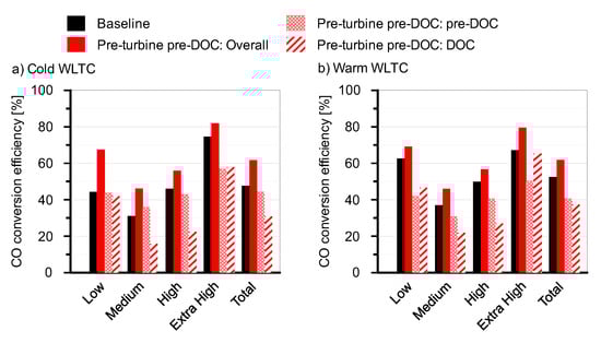CO conversion efficiency in each WLTC phase in (a) cold and (b) warm tests: baseline (DOC) and pre-turbine pre-DOC (overall and contributions from pre-DOC and DOC) configurations.