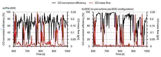 Instantaneous CO conversion efficiency and mass flow in (a) pre-DOC and (b) DOC (pre-turbine pre-DOC configuration) during the medium speed phase of the cold WLTC.