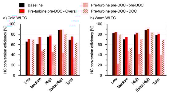 HC conversion efficiency in each WLTC phase in (a) cold and (b) warm tests: baseline (DOC) and pre-turbine pre-DOC (overall and contributions from pre-DOC and DOC) configurations.