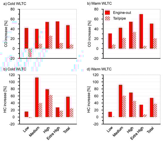 Despite the increase in overall CO and HC conversion efficiency with pre-turbine pre-DOC configuration, the parallel increase of the engine-out CO and HC emissions canceled these improvements out. Figure 13 shows the variation of the cumulative engine-out and tailpipe CO and HC emissions brought by the pre-turbine pre-DOC configuration in each WLTC. Even though the increase of the engine-out emissions were completely countered in low-speed phases of cold WLTC, the total cumulative tailpipe emissions increased for CO and HC. Nevertheless, there are two relevant remarks. First, the percentage penalty was always lower in tailpipe than engine-out emissions. In addition, the penalties were lower in cold conditions ( for CO and for HC) than in warm WLTC ( for CO and for HC) despite the similar percentage increase of engine-out emissions. These two trends confirm the potential for cold-start conversion efficiency improvement of pre-turbine ATS provided that the effects on the engine operation were minimized.