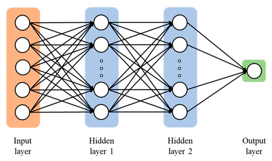 DNN consists of more layers and neurons than ANN, leading to its ability to learn functions with a high degree of complexity. DNN possesses a powerful representational ability of input data and can reduce over-fitting issues in regression performance [30]. With powerful representational ability, DNN is able to achieve high accuracy in various tasks [31]. A typical DNN network structure is presented in Figure 2, including two main forward and backward phases.