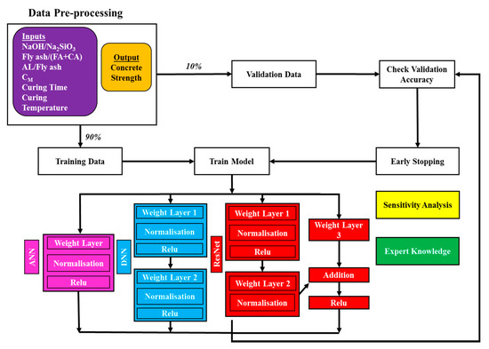 In the first phase, six predictive models based on three proposed machine learning approaches (ANN, DNN, and ResNet) were trained and validated using randomly shuffled datasets obtained from experimental works. Input variables in the dataset consisted of six parameters including mixture proportions (i.e., NaOH/Na2SiO3, fly ash/aggregate, AL/fly ash), NaOH concentration, and curing conditions. Compressive strength of FAGP specimens was regarded as output variable. The results from the first phase were aimed to provide a short list of models to further test with K-fold cross validation and the t-test method as described in Section 4.