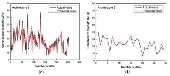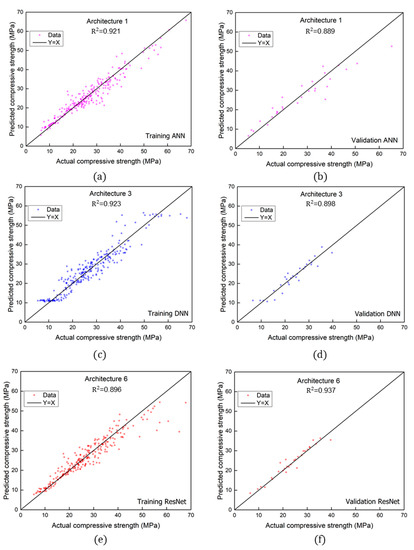 Relationship between compressive strength values obtained from experiments (actual value) and machine learning approaches (predicted value): (a) training ANN; (b) validation ANN; (c) training DNN; (d) validation DNN; (e) training ResNet; (f) validation ResNet.