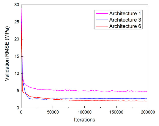 The relationship between iterations of the three best performed architectures (1, 3, and 6) and validation RMSE is shown in Figure 8. The highest convergence speed was observed in ResNet-based architecture 6 model, which required only 2000 iterations to reach a validation RMSE of 4.8 MPa. For the same RMSE, higher iteration numbers of 6000 and 148,000 were required for DNN and ANN models, respectively. After convergence, sufficiently low values of RMSE were observed in the ResNet and DNN models, indicating better performances over the ANN model. For instance, at the same iteration value of 152,000, the ANN model converged at an RMSE of 4.7 MPa while ResNet and DNN models achieved lower values of RMSE (2.1 MPa and 2.7 MPa, respectively).