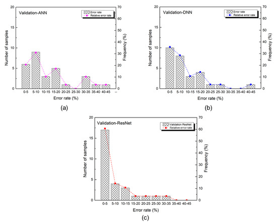 Error rate distribution of three proposed approaches: (a) validation ANN; (b) validation DNN; (c) validation ResNet.