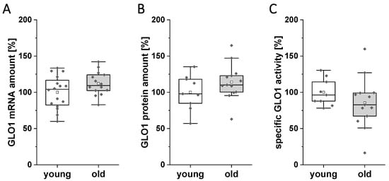 Quantification of GLO1 mRNA, protein and enzymatic activity in the ovary of young and old rabbits at day 6 p.c. (A) GLO1 mRNA levels were quantified by qPCR. (B) GLO1 protein was measured by the Simple Western method. Both mRNA and protein amount were normalised to the levels of vinculin. (C) Enzymatic GLO1 activity was measured spectrophotometrically in 10 µg ovarian protein lysate. Specific GLO1 activity was calculated relative to GLO1 protein amount within the same sample. Results are shown as box plots. All values are expressed in per cent, with young rabbits = 100% (n ≥ 9).