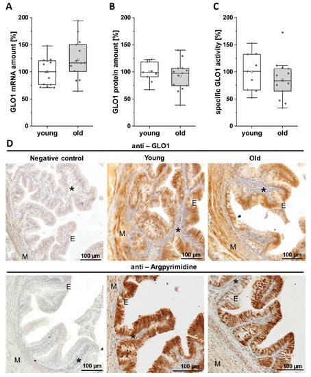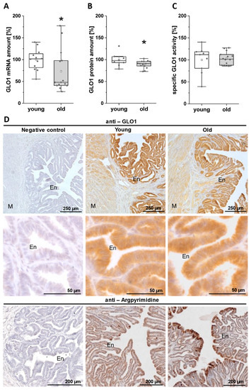 The uterus, especially the endometrium, are crucial organs for embryo implantation and the establishment of a successful pregnancy. We analysed the GLO1 expression and activity in the pregnant uterus at day 6 p.c. In the endometrium of old rabbits, we observed significant lower GLO1 mRNA and protein levels (Figure 4A,B), whereas the specific GLO1 activity was not altered (Figure 4C).