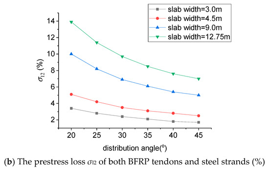 As described in Figure 1, given the same slab width and distribution angle of the prestressed reinforcement, the prestress loss σl1 of the BFRP tendon was far lower than that of the steel strand, and the difference showed a tremendous increase with the decrease of the slab width and the increase of the distribution angle. When the slab width was 3.0 m and the distribution angle was 45°, the difference in σl1 between the BFRP tendon and steel strand reached the maximum value of 10.9%, which illustrated that the use of BFRP tendon can significantly reduce the prestress loss during the prestressing stage, especially with a smaller slab width and a greater distribution angle.