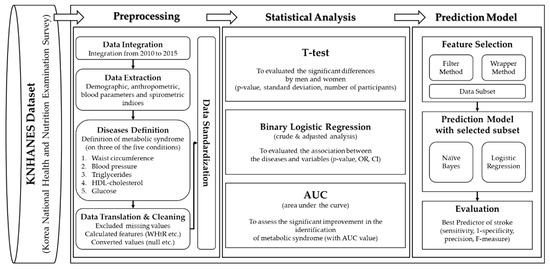 Finally, we performed data standardization for comparison and analysis. In the statistical analysis, we implemented three methods to analyze the associations of various indices with MS. A t-test was conducted to evaluate significant differences between men and women. We conducted a binary logistic regression analysis to identify significant associations with the measured variables (anthropometric and spirometric factors and blood parameters) and determined differences between normal subjects and those with MS. We used an area under the curve (AUC) from the receiver operating characteristic (ROC) curve to assess whether significant improvement in the identification of MS was achieved based on anthropometric factors, blood parameters, and spirometric factors. Since no method exists to calculate the AUC in a complex sampling analysis, we analyzed the recognized performance by the general AUC analysis. Finally, we constructed a prediction model using machine learning algorithms based on the feature selection method for predictive power by sensitivity, 1-specificity, precision, and AUC [43]. Figure 1 shows the design of this study for preprocessing and statistical analysis.
