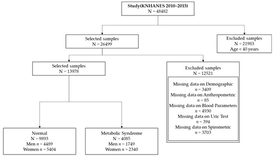 We focused on participants aged ≥ 40 years in this study because the prevalence of MS increases rapidly in this age group [44]. This yielded a sample size of 26,499 subjects. We excluded subjects with the following measurements: demographics (n = 3409), anthropometric factors (n = 85), blood parameters (n = 4930), uric test results (n = 394), and spirometric factors (n = 3703). Thus, the study comprised 13,978 subjects, and the final dataset consisted of 9893 normal subjects (4489 men and 5404 women) and 4085 subjects with MS (1749 men and 2340 women). Figure 2 presents a flow chart showing details of the sample selection procedure.
