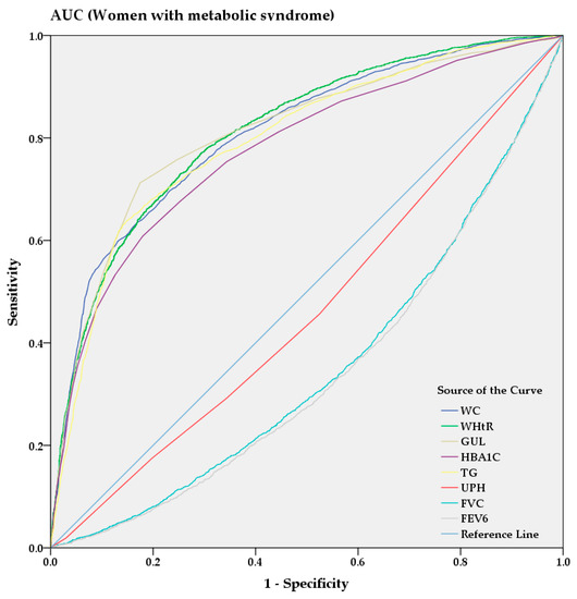 From the AUC analysis, Figure 3 and Figure 4 show the predictive power of anthropometric and spirometric factors, blood and urinary parameters for MS in Korean men and women. Among all factors, TG (AUC = 0.787 [0.775–0.799]) showed strong predictive power in men, whereas WHtR (AUC = 0.813 [0.802–0.823]) demonstrated the highest AUC value in women. GUL and HBA1C exhibited strong predictive powers among the blood parameters in men (AUC = 0.776 [0.764–0.789] and AUC = 0.712 [0.697–0.726], respectively) and women (AUC = 0.810 [0.799–0.821] and AUC = 0.776 [0.765–0.788], respectively). Among the spirometric factors, FEV6 and FVC showed strongest negative predictive power for men (AUC = 0.413 [0.398–0.429] and AUC = 0.423 [0.407–0.438], respectively) and women (AUC = 0.460 [0.447–0.474] and AUC = 0.465 [0.452–0.479], respectively).