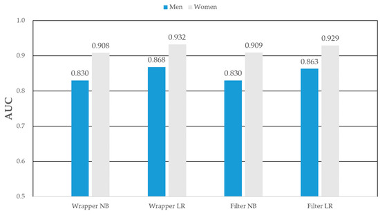 The performance of models was compared and evaluated based on sensitivity, 1-specificity, F-measure, AUC, area under the precision-recall curve (AUPRC), and root mean square error (RMSE) [47]. As shown in Table 6, for men, the sensitivity, 1-specificity, and F-measure of the prediction model (Wrapper LR [Logistic Regression]) were 0.926, 0.449, and 0.882 in the normal group and 0.551, 0.074, and 0.633 in the MS group, respectively. Among women, the sensitivity, 1-specificity, and F-measure were 0.930, 0.261, and 0.911 in the normal group and 0.739, 0.070, and 0.778 in the MS group, respectively.