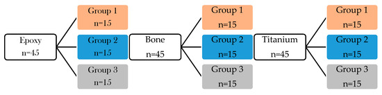GROUP 1: The samples (bone (n = 15), epoxy (n = 15), titanium (n = 15)) were stuck to a glass slide (n = 45) with a small amount of thermoplastic adhesive at 120 °C and then the specimens were placed into a clamping device to ensure the uniform thickness of the adhesive layer between the sample and glass slide until the thermoplastic adhesive cooled down. (Figure 1 orange color-coded boxes).