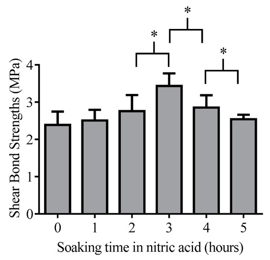 Statistical analysis for SBS and contact angle data were performed using Student’s t-test with SPSS 17.0 software (IBM, Armonk, NY, USA). All of the tests’ accuracies were set at a significance level of 0.05.