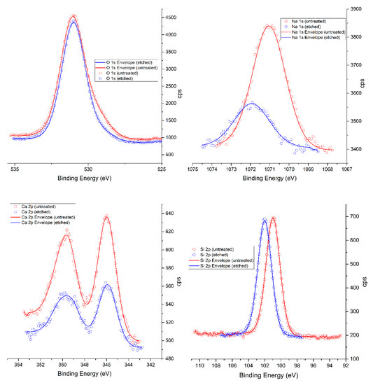 Core level spectra of untreated (red) and acid-etched (blue) glass samples: O 1s, Na 1s, Ca 2p, and Si 2p.