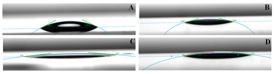 Wetting ability is an important factor in adhesion. The contact angle describes the wetting ability of a liquid on a solid surface. The contact angle measurements are summarized in Table 4. The water contact angle was 25.20° on the unprotonated glass that means the microscope slide has a hydrophilic nature (Figure 5A). The water CA was 5.12° on a protonated microscope slide that significantly (p < 0.05) decreased compared to the untreated surface (Figure 5C). The significantly decreasing effect can also be observed at MDP containing bond material CA on the bare and protonated glass surface (Figure 5B,D) (p < 0.05).