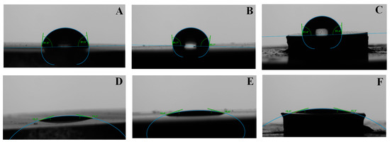 Representative pictures of the contact angle of the water (A–C) and MDP containing bond material (D–F) on epoxy (A,D), bone (B,E), and titanium surface (C,F), respectively.