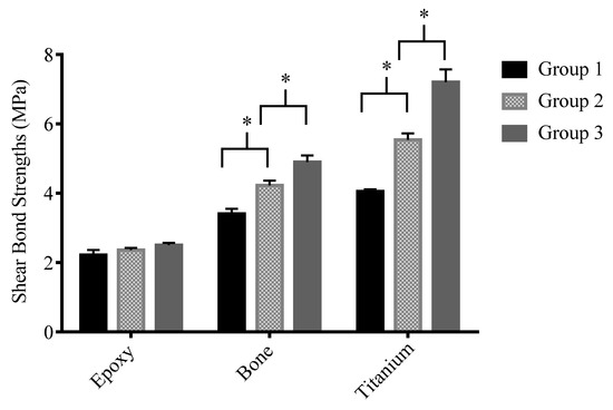 Mean shear bond strengths (SBS) value with standard error mean (SEM) at epoxy, bone, and titanium samples in the aspects of thermoplastic adhesive (Group 1), MDP containing bond material + resin matrix (Group 2), protonated glass surface, MDP containing bond material + resin matrix (Group 3) (n = 15). * p < 0.05.