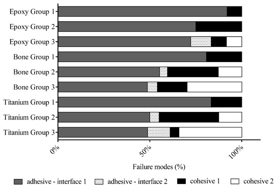 The results of the failure modes of SBS measurements are presented in Figure 8 in the aspect of section ingredients (epoxy, bone, titanium) with different adhesives.
