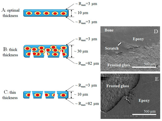 The water CA on epoxy, bone, and titanium was 81.60°, 95.51°, and 91.04°, respectively. The components significantly differ from each other in the aspect of water wetting ability (p < 0.05). (Figure 6A–C). The glass hydrophilic nature and hydrophobic nature of epoxy, bone, and titanium have to fit each other in a good adhesion situation. To reach this state a well-chosen adhesive is required that moisturizes all ingredients well. The MDP containing bond material CA data on epoxy, bone, and titanium were 14.73°, 16.40°, and 14.88°, respectively (Figure 6D–F). Consequently, the MDP containing bond moisturizes the components of the thin bone section very well. Statistical analysis showed significant differences between the epoxy and bone (p < 0.05), but epoxy and titanium did not differ significantly at the wetting study of MDP adhesive. Based on the contact angle measurements it was found that the MDP containing bond material behaves like a good wetting liquid on the glass and components (epoxy, bone, titanium) and it can be a well-chosen adhesive to contribute to a stronger adhesion between the glass slide and thin section.