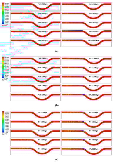 Figure 3 shows the simulation results of stratified flow and bubble flow. When GVF ≤ 4%, the flow pattern is bubble flow with small dispersed bubbles. However, in the process of gas-containing fluid flowing through the measuring tube, due to the influence of pressure drop in the pipeline, the bubbles uniformly distributed at the back of the tube are slightly larger than those at the front. When GVF > 4%, The flow patterns change with the initial total flow at the inlet. When the total mass flow is low (0.09120~0.3420 kg/s), due to a density difference between gas and liquid, the liquid flows at the bottom of the pipe. The gas flows through the liquid and distributes it in the upper part of the pipeline. The two phases are completely separated by gas-liquid cross-section, showing stratified flow [23]. With the increase in the total mass flow of gas-containing fluid to 2.280 kg/s, bubbles are easy to break under the action of the high-speed flow of fluid, forming a bubble flow with uniform distribution.