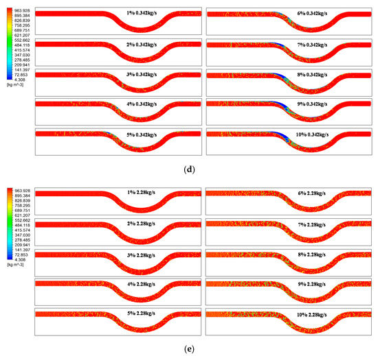 The total mass flow inlet parameters of two-phase fluid (the real values of total mass flow) are respectively set to five conditions: 0.09120, 0.1368, 0.228, 0.3420, and 2.280 kg/s. The flow patterns are shown in Figure 3.