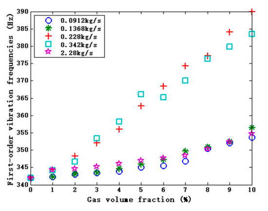 It can be seen from Figure 4 that the vibration frequencies of the tube increase with the entrained gas content when the two-phase fluid with the same mass flow flows through measuring tube. Its frequencies are closely related to the mixing density and fluid-solid coupling of the measured fluid. Besides, when the total mass flow of two-phase fluid with the same density changes, the vibration frequencies of the measuring tube also change. This also means that the flow patterns affect fluid-pipeline coupling, thus influencing the vibration frequencies of the tube. The generation of stratified flow weakens the coupling between the fluid and the pipe, which may be due to the relative motion of the gas and liquid phases to form a wholly separated flow state. In bubble flow, the more uniform the bubble distribution, the stronger the coupling effect. This is because the existence of uniform bubbles only affects the change in mixing density and increase in compressibility but does not show the occupation of liquid space.