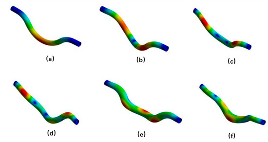 The first six order mode shapes of the micro-bend measuring tube. (a) First-order vibration mode; (b) Second-order vibration mode; (c) Third-order vibration mode; (d) Fourth-order vibration mode; (e) fifth-order vibration mode; (f) Sixth-order vibration mode.