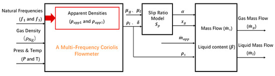 For gas-liquid two-phase flow, it can be seen from Equations (3) and (4) that the measured density of fluid provided by a single-frequency Coriolis flowmeter is affected by the gas [16]. Measuring results cannot be determined, which may reduce the measurement accuracy. There are three unknown independent variables in the measurement of gas-containing fluid: liquid flow, gas flow, and volume void fraction (or cross-section void fraction) [17]. The accurate measurement of gas-containing fluid needs to be realized by adding at least one additional measured independent parameter (or a principle formula) based on two independent variables of single-frequency Coriolis flowmeters [18].