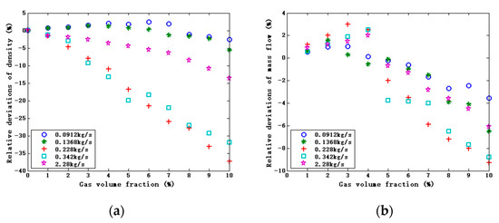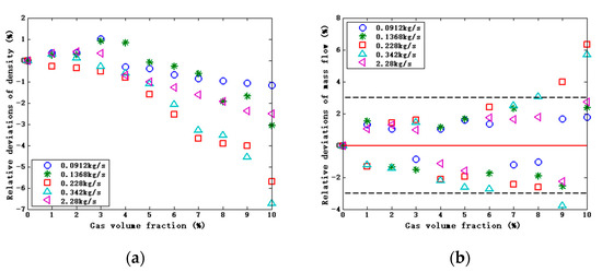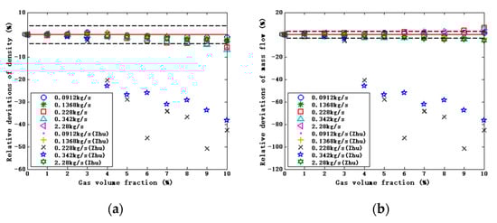 The deviations relative to GVF after correction by the proposed compensation model. (a) Relative deviations of density. (b) Relative deviations of mass flow.