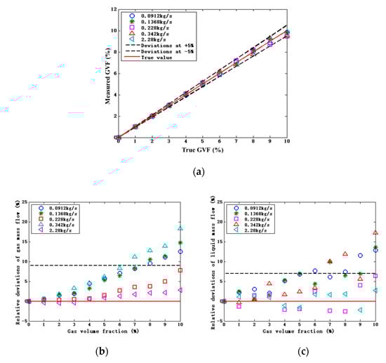 The deviations relative to GVF after correction by the proposed compensation model. (a) Gas-phase content. (b) Relative deviations of Gas-phase mass flow. (c) Relative deviations of Liquid-phase mass flow.