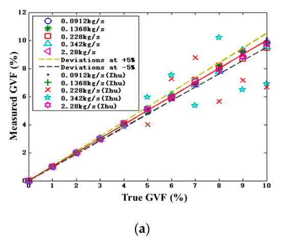 Given the gas density, two expressions the same as Equation (29) are combined to solve two unknown parameters: and . Then the corrected density in the measured liquid is determined. Finally, the gas mass fraction can be obtained from Equation (19) by using the obtained cross-section void fraction and liquid density.