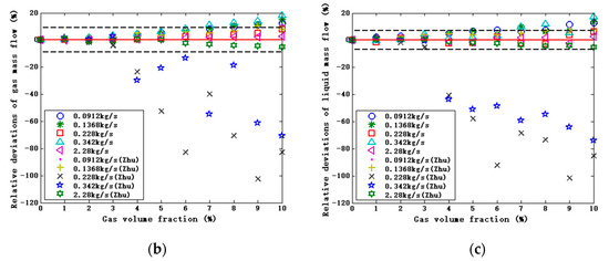 Taking the two vibration frequencies of the measuring tube, and apparent densities of the measured fluid as the input parameters, the calculated gas and liquid contents can be converted to the gas-phase and liquid-phase mass flows in the stratified flow. The corrected relative deviations in the gas-liquid two-phase flow are obtained from Equations (42) and (43), respectively. The calculation results are shown in Figure 9.