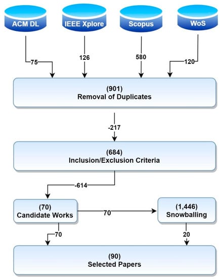 Figure 1 reflects the flows of the search and selection processes applied, and show the outcome of every task. A final set of 90 primary research papers was selected for this research study (a list with full bibliographic references is provided in Appendix A).