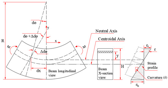 In the above, is a curvature equal to the slope of the strain profile at R is the curve radius, y is a vertical distance from the neutral axis, is the strain at depth y, is strain at the top fiber, strain the bottom fiber, H is the height of the beam, x is the distance along the member length, and is the rotation angle, as shown in Figure 1. The strain due to moisture loss is obtained according to Equation (8).