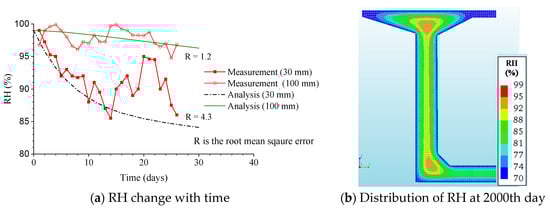 Figure 3a shows a comparison of the RH changes with time based on analysis and measurement at depths of 30 and 100 mm. The diffusion coefficient of the concrete calculated for the assumed atmospheric RH value and the evaporation rate at the surface with a value of 3 × 10−9 m/s gave the best results. The figure shows that the results are in reasonably good agreement with the measured values as reported by Huang et al. [2]. The moisture distribution at the half-section of the bridge at 2000 days is presented in Figure 3b. It can be seen that the moisture content varies across the section according to the thickness of the members and exposure conditions. Hence, the shrinkage strain varies along the depth from the surface, resulting in additional curvature and deflection.