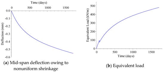 The resulting distribution of the RH across the beam section at different times is presented in Figure 5. Because the evaporation rate was assumed to be the same on all surfaces and the section is symmetrical, the RH values at the top and bottom surfaces are similar. This means that the deflection owing to nonuniform shrinkage is induced owing to the presence of a relatively larger area of reinforcement at the bottom section, as shown in Figure 4. The prestressing and reinforcing bars are mostly located under the neutral axis of the beam section, which restricts the shrinkage strain at the bottom of the beam. Hence, the actual unrestricted strain of the top face of the beam becomes larger than that of the bottom face. As a result, a downward deflection is induced. The resulting deflection has a very small value, i.e., only 0.56 mm at the 1700th day, as shown in Figure 6a. Figure 6b shows the equivalent load calculated for the nonuniform shrinkage deflection in Figure 6a. The equivalent load at 84 days decreases as shown in Figure 6b because it is adjusted by a load adjusting factor of 0.85 on the 84th day, i.e., the onset of cracking, which can be estimated from the structural analysis using Model-2. It should be noted that the negative deflection in Figure 6a indicates a downward deflection, whereas in Figure 6b, the positive equivalent load indicates the downward distributed load.