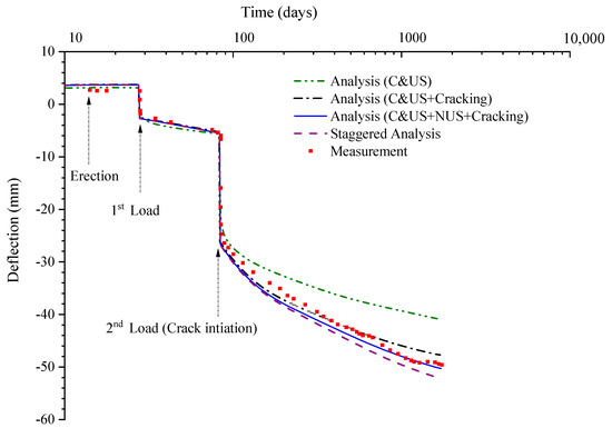 As can be seen in Figure 13, the staggered analysis and combined analysis using the equivalent load for nonuniform shrinkage (C&US+NUS+Cracking) gave the results closest to the measured data up to 380 days. In contrast, the analysis using the built-in MC2010 model for creep and uniform shrinkage (C&US) without considering cracking and the analysis considering creep and uniform shrinkage together with a stiffness reduction of the concrete by cracking (C&US+Cracking) failed to predict the long-term deflection. The cracking initiates in the support area, when the self-weight and the prestressing force is applied on the 5th day (see Figure 14). The analysis without considering cracking (C&US) results in a lower upward deflection (camber) at the erection relative to the other analyses. The analysis considering cracking but not nonuniform shrinkage (C&US+Cracking) overestimates the upward deflection. The nonuniform shrinkage has a more significant contribution to the downward deflection throughout the analysis period than that in the short-span PSC beam case (case A) owing to the larger girder section. The final deflection owing to nonuniform shrinkage alone is only 4.5 mm in the moisture transport analysis but is raised to 9.5 mm in the combined analysis (C&US+ NUS+Cracking) and to 5.7 mm in the staggered analysis, owing to the combined action of cracking and creep as discussed in Section 4.2.
