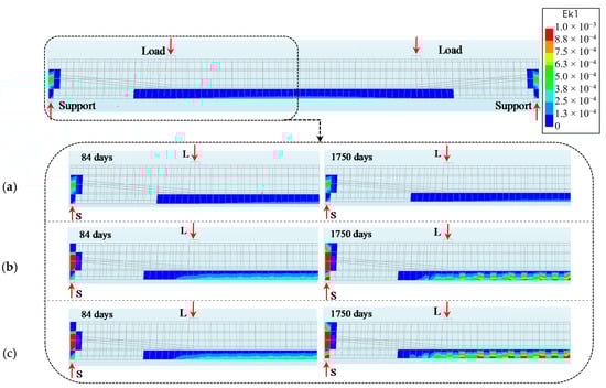 Distribution of crack strain of the short-span PSC beam at 84th and 1750th days. (a) Cracking only; (b) C&US+Cracking; (c) C&US+NUS+Cracking.