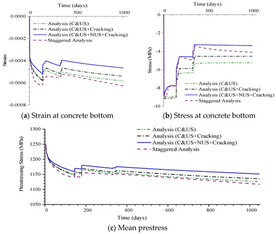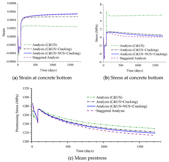 Figure 9 shows the variations of the strain and stress of the concrete bottom and mean prestress at the mid-span section with time. As shown in Figure 9a, in all analyses, the tensile strain occurs at the bottom after 84 days. The tensile strains from the staggered analysis and equivalent load analysis (C&US+NUS+Cracking) are the largest owing to the non-uniform shrinkage. However, as shown in Figure 9b, the tensile stresses are smaller in the analyses considering cracking because the cracks relieve stress. The tensile stresses from the staggered analysis are the smallest owing to the larger deflection and larger crack strain. In addition, as shown in Figure 9c, the staggered analysis gives the lowest prestress. This suggests that the total shrinkage strain (uniform plus non-uniform shrinkage) is larger at the center of the prestressing tendons in the staggered analysis than in the equivalent load analysis.
