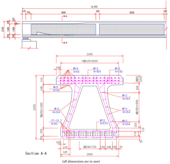 The second example analysis was performed for a 40-m span precast PSC box girder bridge for railways located in Osong, South Korea. It was erected at the end of 2017. The girder has a total height of 2.2 m. The thickness of the bottom slab is 0.34 m, and that of the top slab is 0.37 m. The details of the shape and dimensions of the girder are shown in Figure 10.
