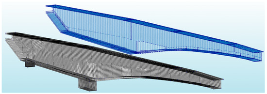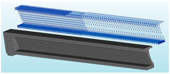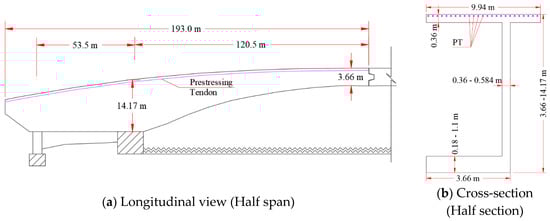 In view of the symmetry of the section, a half-span of the beam was modeled to save computation time. Espion and Halluex reported that the compressive strength of the concrete at the time of prestressing was 32.4 MPa [23]. Accordingly, based on MC2010 [13], the material properties of concrete were assumed as follows: Young’s modulus = 32 GPa, mean compressive strength = 33 MPa, uniaxial tensile strength = 2.56 MPa, and unit weight = 2350 kg/m3. For the prestressing and non-prestressing reinforcing bars, it was assumed that the elastic modulus was 200 GPa, and the unit weight was 7850 kg/m3.