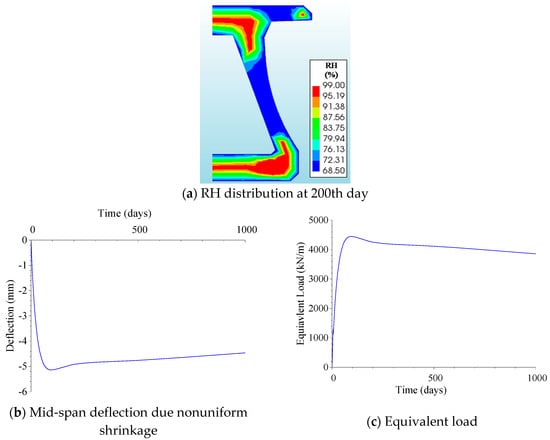 RH distribution in the girder section and variation of mid-span deflection owing to nonuniform shrinkage and equivalent load with time in the medium-span PSC box girder.