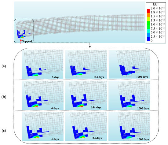 Distribution of crack strain of the medium-span PSC box girder at 6th, 144th, and 1000th days. (a) Cracking only; (b) C&US + Cracking; (c) C&US + NUS + Cracking.