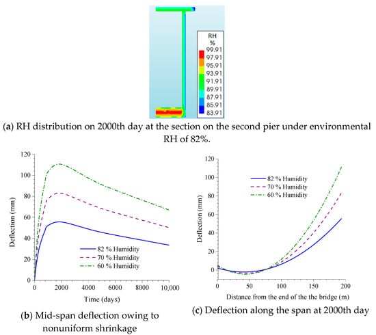 The analysis result in Figure 18 shows that the deflection owing to the non-uniform shrinkage is upward owing to the cantilever arrangement of the bridge and rises up to 55.5 m on the 2000th day when exposed to 82% RH. After that, as the RH inside the concrete approaches equilibrium with the atmospheric RH, the deflection slowly decreases to a final value of 33.5 m at the end of the analysis period. As the atmospheric RH decreases, the resulting deflection (in this case, the camber) caused by the nonuniform shrinkage increases, as shown in Figure 18.