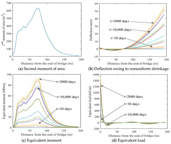 As the bridge is non-prismatic, the second moment of area of its section is calculated at every meter along the length of the bridge, as shown in Figure 19a. The deflection owing to the non-uniform shrinkage is extracted every 0.5 m at the top slab and is formulated as a function of the length of the bridge. From this data, the moment and equivalent load are derived, as shown in Figure 19c,d.